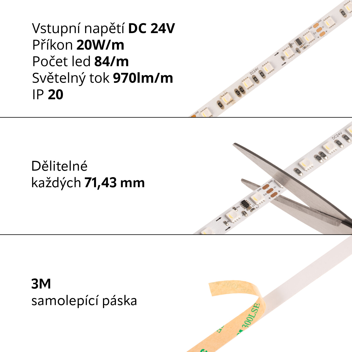 Digitální RGBW LED pásek řízená čipem WS2814F, hustotou 84LED na 1 metr a napájecím napětím 24VDC. Digitální LED pásek slouží k vytváření pokročilých světelných efektů v osvětlení. Na rozdíl od běžných LED pásků, které svítí jednolitě po celé své délce, tento digitální LED pásek umožňuje individuální ovládání každé LED samostatné zvlášť. K ovládání digitálních LED pásků je nutné použít k tomu určené ovladače nebo speciální řídící jednotky. LED pásek prodáváme pouze na celé metry.