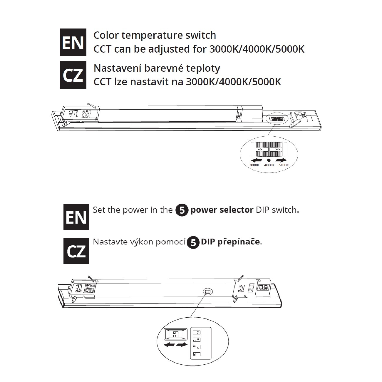 Na zdroji svítidla se nachází také přepínač pro nastavení teploty světla (CCT). Podle potřeby si můžete přímo při instalaci zvolit jednu ze tří barev světla: