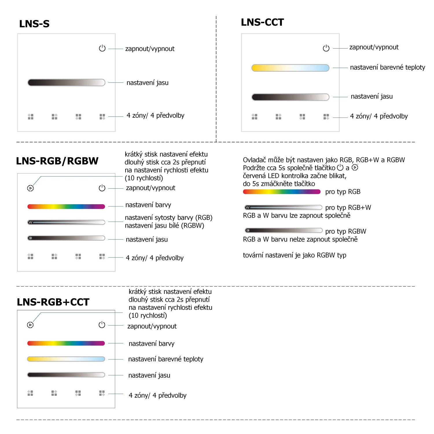 | Barva ovládaného světla | RGB a RGBW | ||