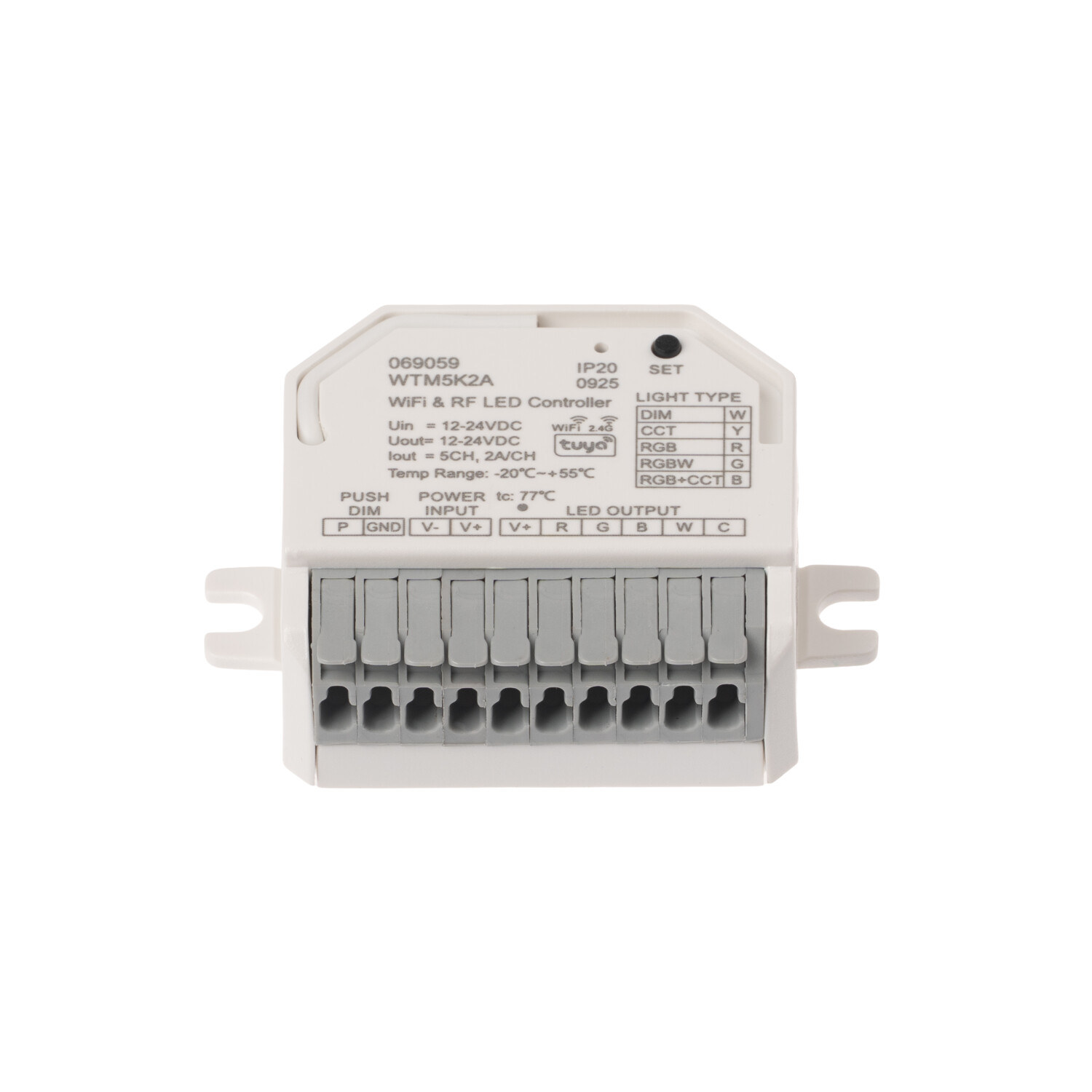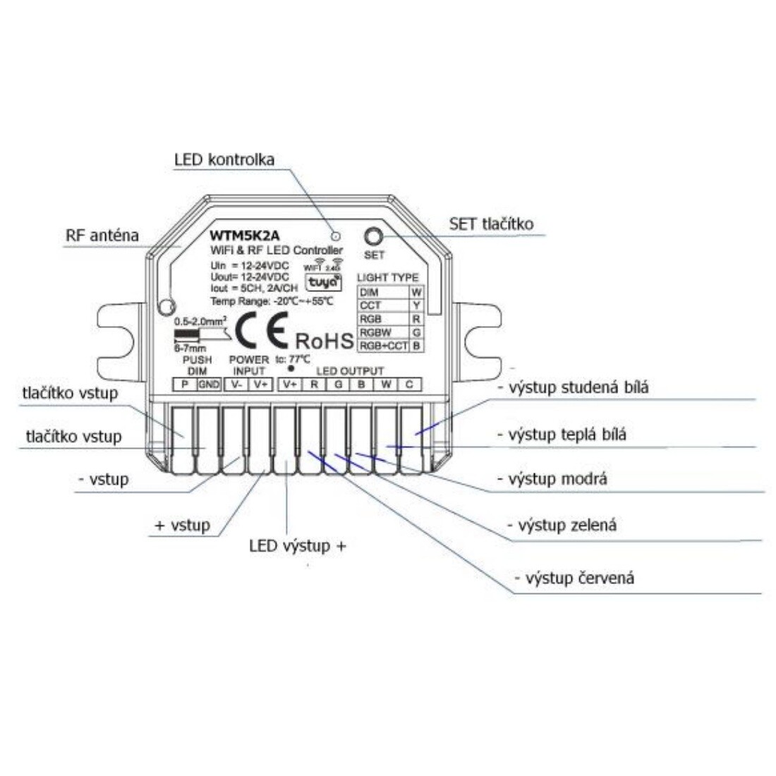 Chytrý radiofrekvenční přijímač stmívač pro LED pásky a jiné LED produkty s podporou aplikace Tuya. Přijímač může být ukrytý (za zdí, sádrokartónem či ve skříni), není nutná přímá viditelnost přijímače pro ovladač. Přijímačem dimLED Tuya WTM5K2A má 5 výstupů a lze ovládat: