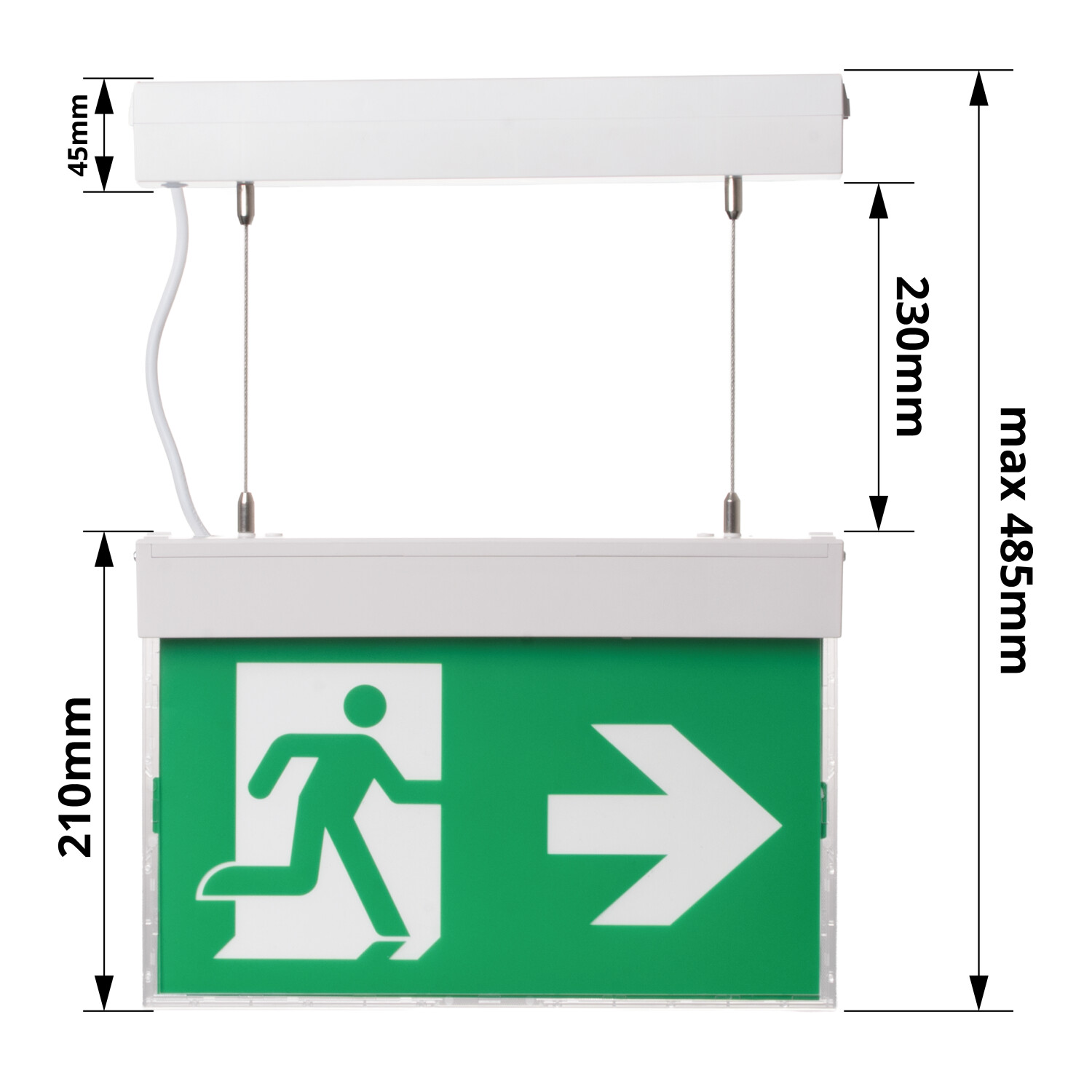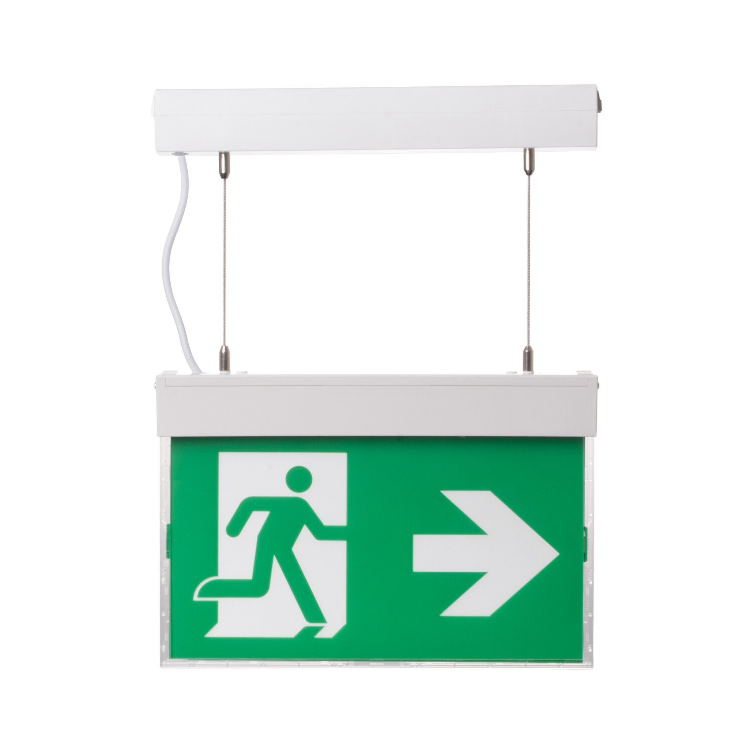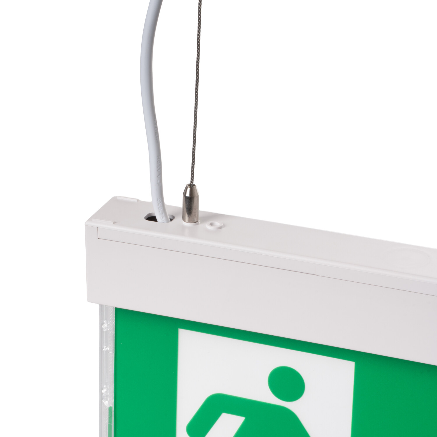 Závěsná montáž na lanka umožňuje optimální umístění svítidla do zorného pole, lepší čitelnost piktogramů a zároveň elegantní řešení v prostorách s netypickou konstrukcí stropu.
